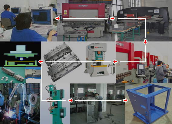 開發&設計 → 激光加工 → 轉塔(tǎ)數衝 → 折(shé)彎 → 模具衝壓 → 焊(hàn)接(jiē)裝配 → 打(dǎ)磨 → 清洗 → 塗裝(zhuāng) → 組裝 → 檢查 → 成品(pǐn)…